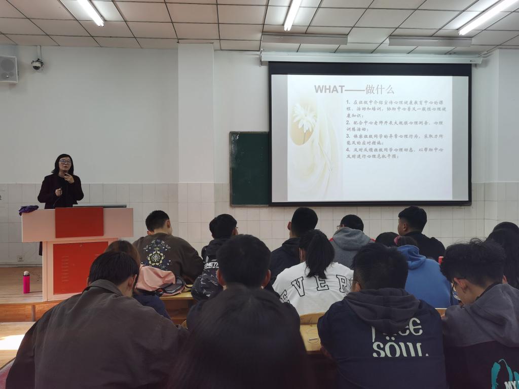 为向学生介绍和宣传心理健康课程,协助心理健康中心普及一般性心理健康知识,配合老师开展心理健康排查及反馈各班同学心理情况。亚洲欧美精品于2020年11月11号中午在教学楼E209教室开展心理健康排查与培训讲座,由心理中心老师陈莉担任主讲。