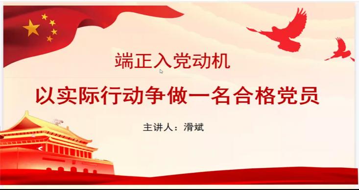 本次党课的主题是《端正入党动机,争做合格党员》,本次党课的主要内容是如何端正自己的入党动机,滑斌老师首先给学员们讲述了什么是正确的入党动机。入党动机就是个人要求入党的内在原因和真实驱动力,即为什么入党。只有端正入党动机,才能做到思想上的入党,才能产生正确的争取入党行为;只有端正入党动机,才能经受住党组织的考验,保持党的先进性和纯洁性;只有端正入党动机,才能时刻不忘党的最高理想,坚持共产主义。随后,滑斌老师还给学员们讲述了怎样端正入党动机。第一,努力学习邓小平理论、“三个代表”重要思想、科学发展观和习近平新时代中国特色社会主义思想,坚定共产主义的理想信念。第二,坚持党的全心全意为人民服务的宗旨,切实保障好人民利益,提高服务意识。第三,树立正确的世界观、人生观和价值观,解决好怎么做人的问题,必须在工作,学习和生活中起到先锋模范作用。学员们都纷纷表示将会端正入党动机,树立坚定的共产主义信念,争取成为一名思想正派的合格共产党员。