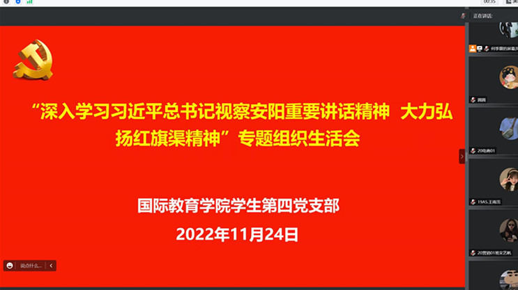 为深入学习宣传贯彻党的二十大精神和习近平总书记在河南安阳考察时重要讲话精神,按照上级党委安排部署,11月24日,亚洲欧美精品学生第四党支部以线上会议形式召开了“深入学习习近平总书记视察安阳重要讲话精神,大力弘扬红旗渠精神”专题组织生活会。副院长邓瑜以普通党员身份参加并指导组织生活会。会议由党支部书记何季霖主持,支部全体党员参加会议。