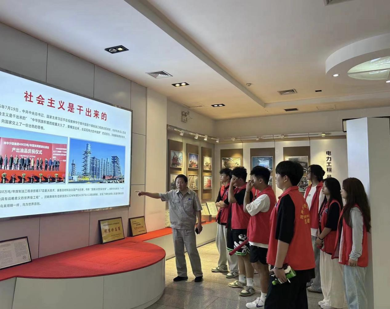 舞钢公司纪念馆位于舞钢市文化中心大楼裙楼内,展厅总面积达1200平方米,是河南省科普教育基地、平顶山市党性教育现场教学点以及平顶山市爱国主义教育示范基地。纪念馆内陈列着大量珍贵的历史文物、图片和影像资料,生动再现了舞钢公司从初创到壮大的全过程。公司职工带领实践队员们走进红色文化展区,近距离感受舞钢公司发展历程中的红色记忆。这里详细记录了我国“三线”建设时期,舞钢市的建设者们如何在艰苦的条件下,万众一心、艰苦奋斗。让实践队员们深刻感受到了革命先辈“自力更生、艰苦奋斗、甘于奉献、众志成城”的革命精神。