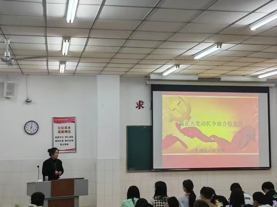 侯丁琳以“当前大学生入党存在的主要问题”为题,组织同学们进行了充分讨论,引出了何为正确的入党动机。她指出,要求入党的同志只有树立了正确的入党动机,才能经受住党组织的考验,才能在实践中不断纯洁入党动机,做到思想上真正入党。她勉励同学们要志存高远、信念坚定;胸怀大局、把握大势;不畏艰辛、脚踏实地;珍惜时光、学有所成。最后,她指出,今年是全面贯彻落实党的二十大精神的开局之年,全体入党积极分子要认真学习宣传党的二十大精神,充分发挥带头作用、骨干作用和纽带作用,在学习、工作、生活中发挥先锋模范作用。