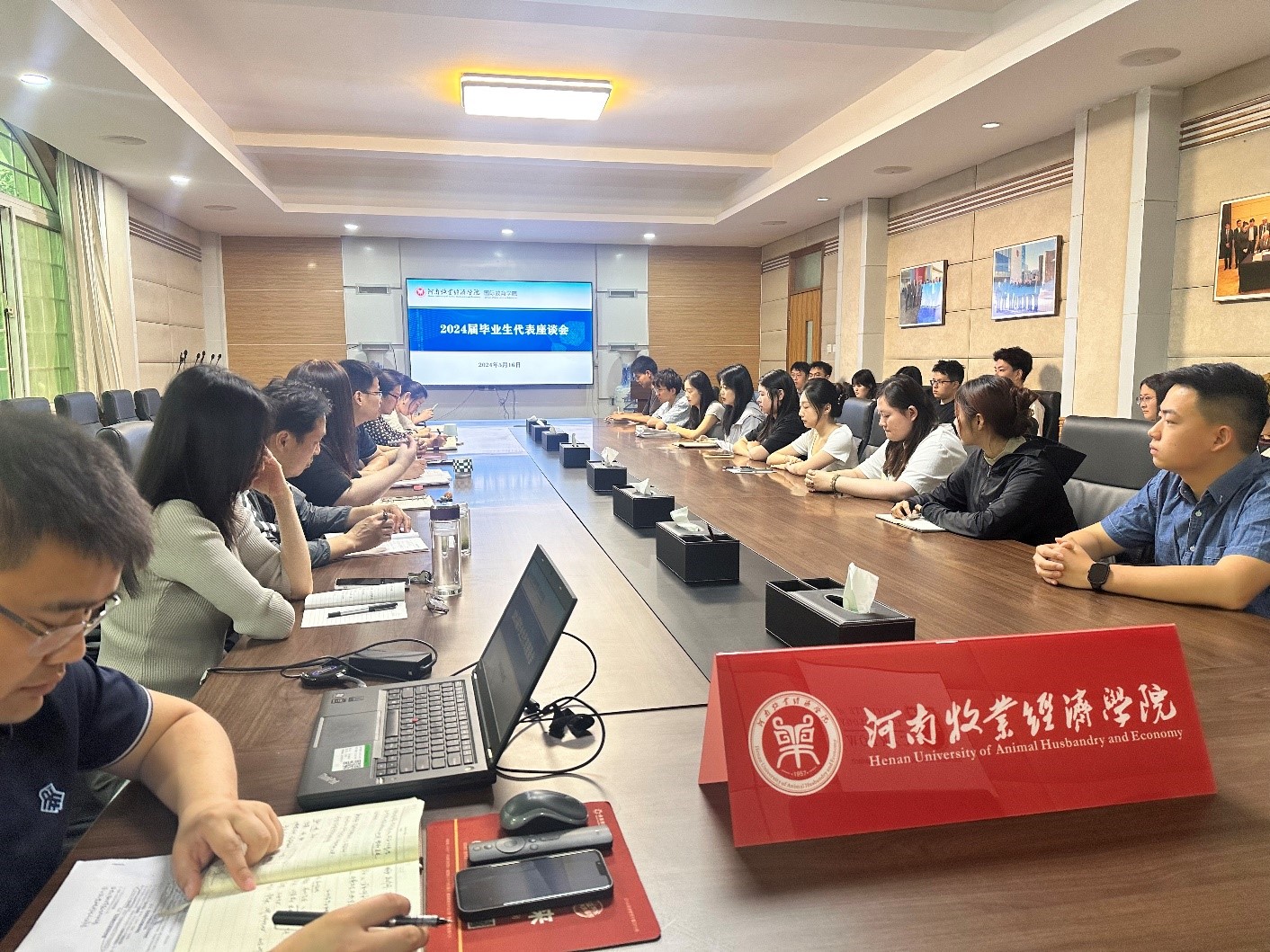 为深化学院与毕业生的沟通交流,听取毕业生们对学院发展的建议,5月16日上午,亚洲欧美精品在教学办公楼113会议室召开2024届毕业生代表座谈会。学院领导班子成员、科级干部及20名毕业生代表参与座谈。会议由院党委副书记李江红主持。