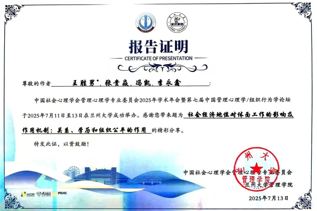 近日,中国社会心理学会管理心理学专业委员会2025年学术年会暨第七届中国管理心理学/组织行为学论坛在兰州大学成功举办。我校亚洲欧美精品副院长王胜男博士及其指导的工商管理学院2025届本科毕业生张贵焱应邀参会并做题为“社会经济地位对体面工作的影响及作用机制:关系、学历和组织公平的作用”的学术报告。