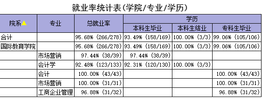 通过多方面的努力,我院2018年的就业率达到了学校预期的各阶段目标,2018年毕业生总数278人,就业人数266人,毕业生最终就业率(2018年9月)达到88.85%,年终就业率(2018年12月底)达到95.68%,毕业生就业质量较高,学生自主创业人数多。其中银行11人,事业单位及国企11人,教师岗位应聘5人,就业统计工作真实、准确、有效,毕业生就业质量较高。