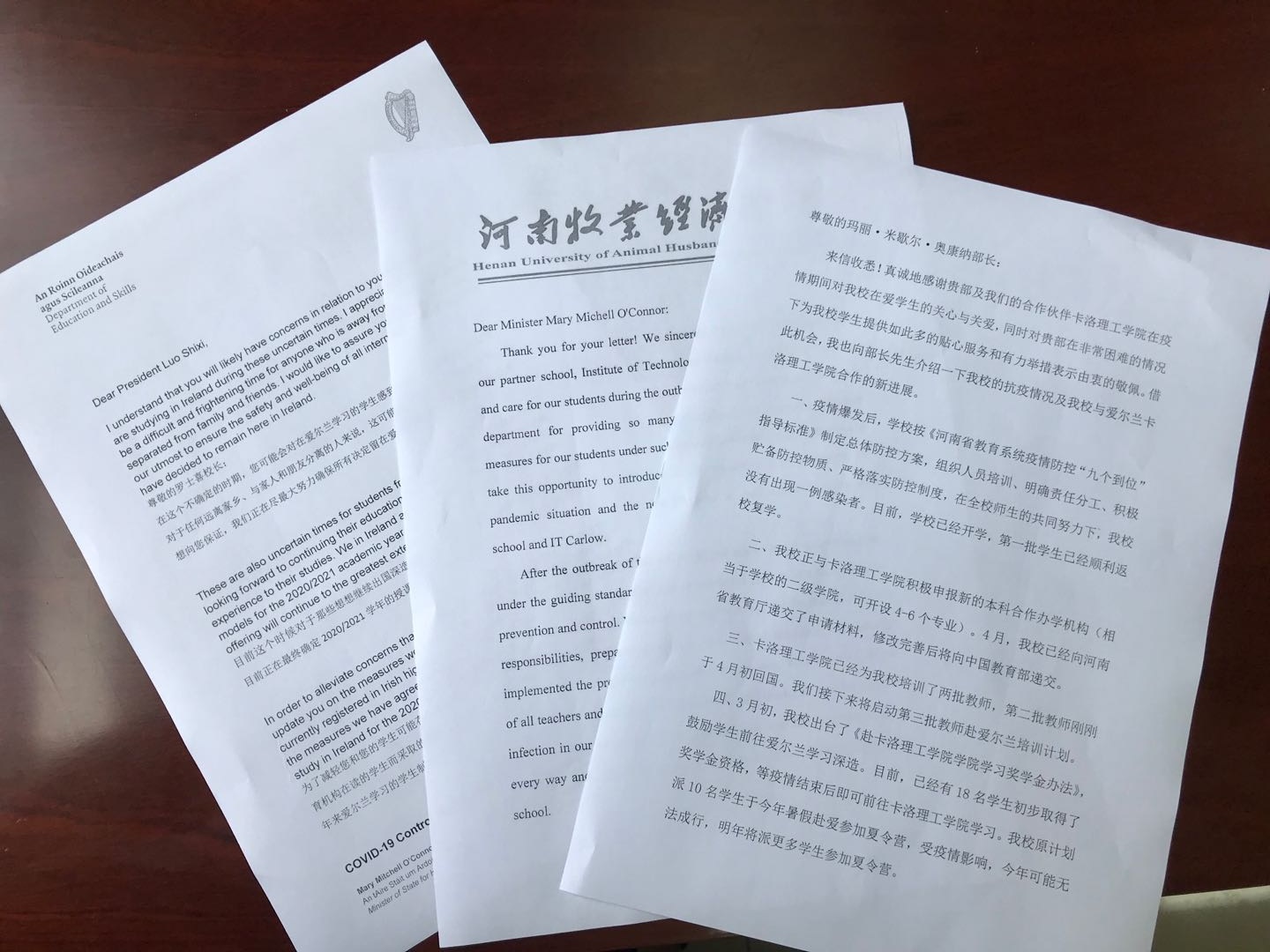随着疫情在国外的蔓延,校领导十分关心、关注我校在外学习生活的师生情况。此时,爱尔兰高等教育国务部长玛丽·米歇尔·奥康纳先生给校长罗士喜写来了一封信,缓解了校领导的担忧。