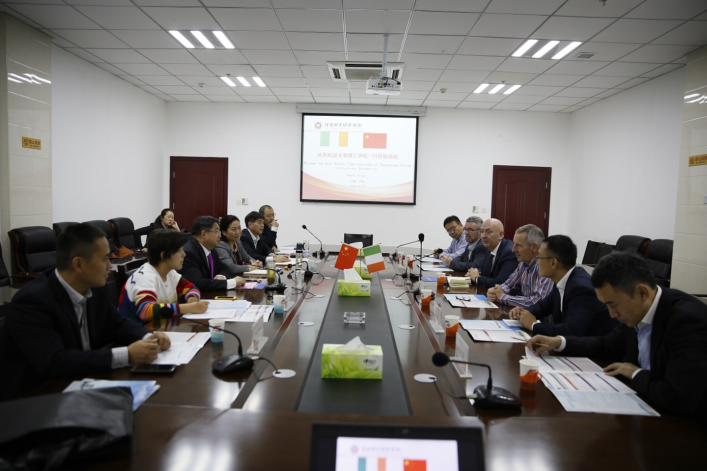 罗校长首先对来宾的到访表示热烈欢迎,罗校长表示,当前国际风云变幻较大,我们更应该有定力,把我们的合作办好。在合作办学这一点上,河南是鼓励的,特别是偏工科的院校来豫办学。罗校长指出,在当前的形势下,我们更需要多赢文化,双方合作意义重大。在谈到双方举办孔子学院问题时,罗校长讲到,东西方文化交流源远流长,很早就开始了,为世界的发展作出了积极的贡献,所以,我们应该互相交流,也希望中国的文化在这个时候能对世界的不安因素产生一定的影响。卡洛理工学院副院长戴可澜对罗校长的邀请表示感谢,他表示,他现在最关心的两个国际事件,一是美国总统的经济政策对爱尔兰的影响,二是英国的脱欧对爱尔兰经济的影响。但我们的合作必须前行,且国际合作是政府对我们的要求。戴可澜副院长还带来了大使先生的问候。